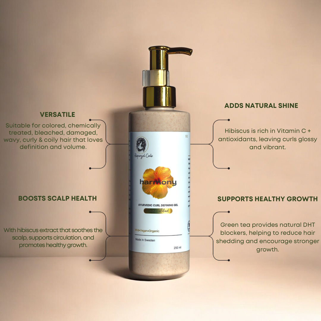 Harmony is a silicone-free, vegan curl-defining gel designed especially for high-porosity curls that crave strength, structure, and long-lasting definition. Each pump delivers botanical proteins and ayurvedic plant extracts that reinforce the cuticle, reduce frizz, and shape flexible, natural-looking curls.